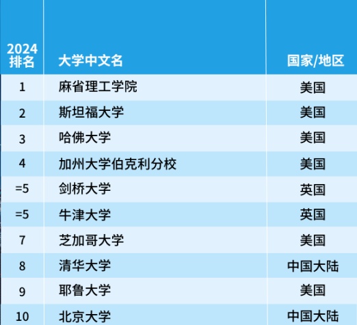 美國的麻省理工學院(MIT)名列該學科領域榜首,而英國的牛津大學則下降了2名位于第5名,劍橋大學上升1名和牛津大學同一名次。