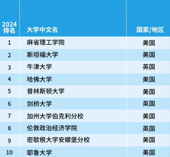 麻省理工學院位于榜首的位置。英國院校中,牛津大學和倫敦政治經濟學院排名與去年一致,劍橋大學上升1名至第6位。