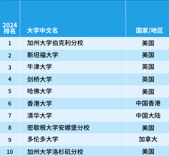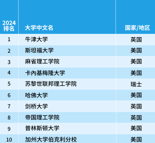 加州大學伯克利分校首次超越斯坦福大學奪得榜首,英國的牛津大學上升2名進入榜單前三,劍橋大學依舊位于第4名。