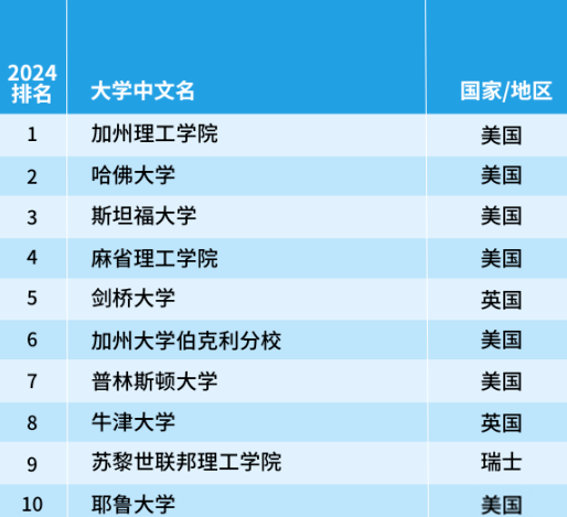 美國的加州理工學院上升3名位于榜首,英國的劍橋大學上升兩名位于第五位,瑞士蘇黎世聯(lián)邦理工學院連續(xù)第八年保持前十名的位置,再次排名第9。