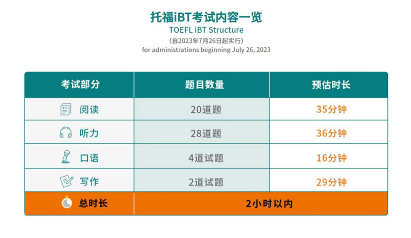 自2023年7月26日起, 托福iBT考試的時長將由三小時縮短至兩小時以內。具體調整如下: